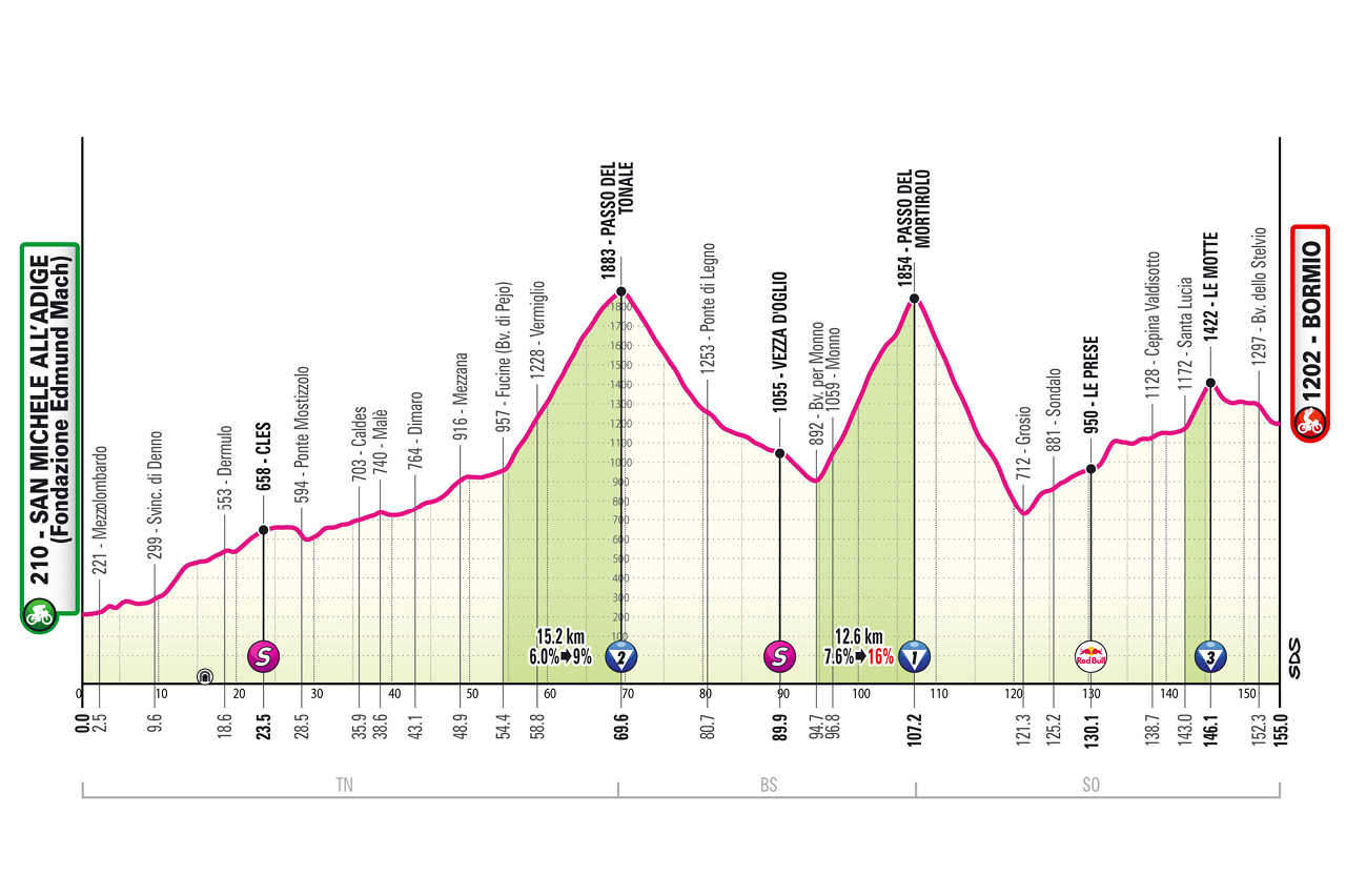 La tappa si apre in Val d’Adige, in una partenza che non concede respiro: si sale subito verso il Passo del Tonale, una classica delle Alpi che, con i suoi 15 km e pendenze regolari, rappresenta un primo banco di prova per gli uomini di classifica. Ma è solo un assaggio: la vera sfida è più avanti.